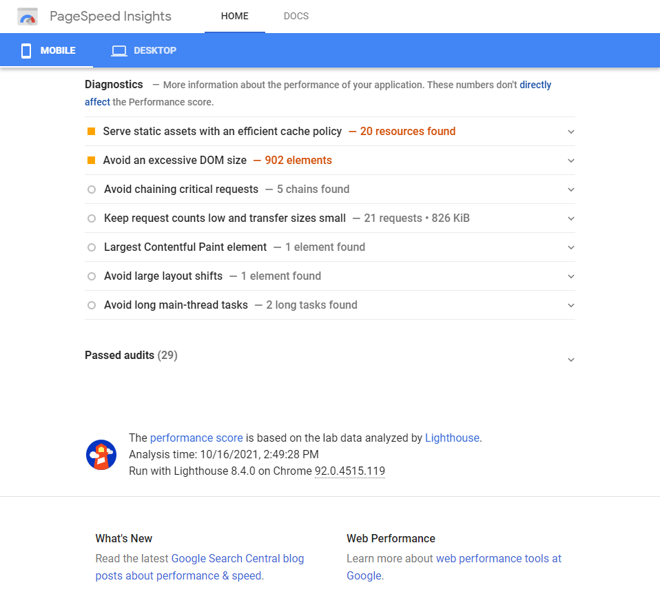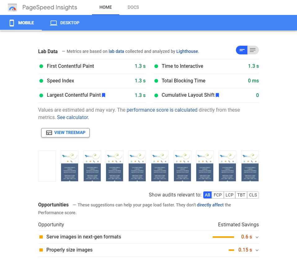 The 100 PageSpeed Insights scores are listed below, for both mobile phones and desktop computers.
